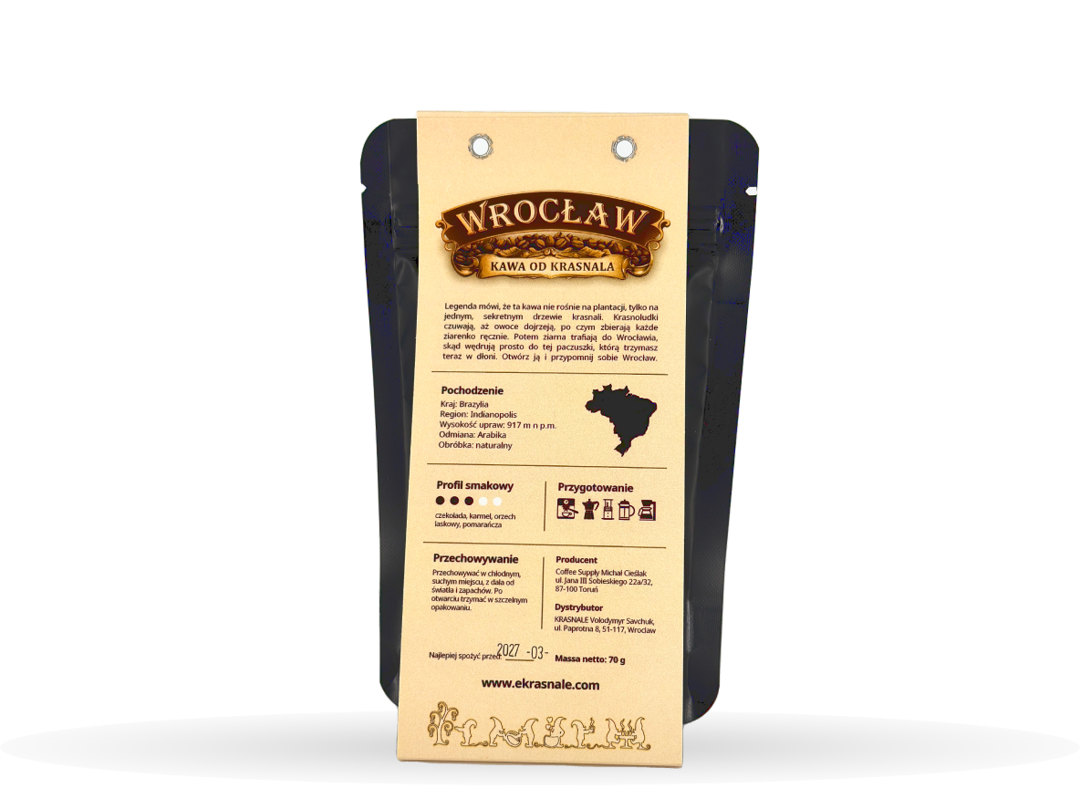 Ważnym elementem tej kawy jest też sama historia umieszczona na odwrocie paczki. Nie jest nachalna, ale tworzy sympatyczne tło dla produktu: krasnale czuwają nad dojrzewającymi owocami, zbierają je ręcznie, a ziarna trafiają potem do Wrocławia i dalej do dłoni kupującego. Taki detal dobrze pasuje do miasta, w którym krasnale są częścią codziennych spacerów, fotografii i wspomnień. Kiedy wraca się z Rynku, z okolic Odry czy z uliczek pełnych kamienic, łatwo zrozumieć, dlaczego właśnie taka pamiątka działa tak dobrze. Jest mała, użyteczna i po prostu przyjemna.