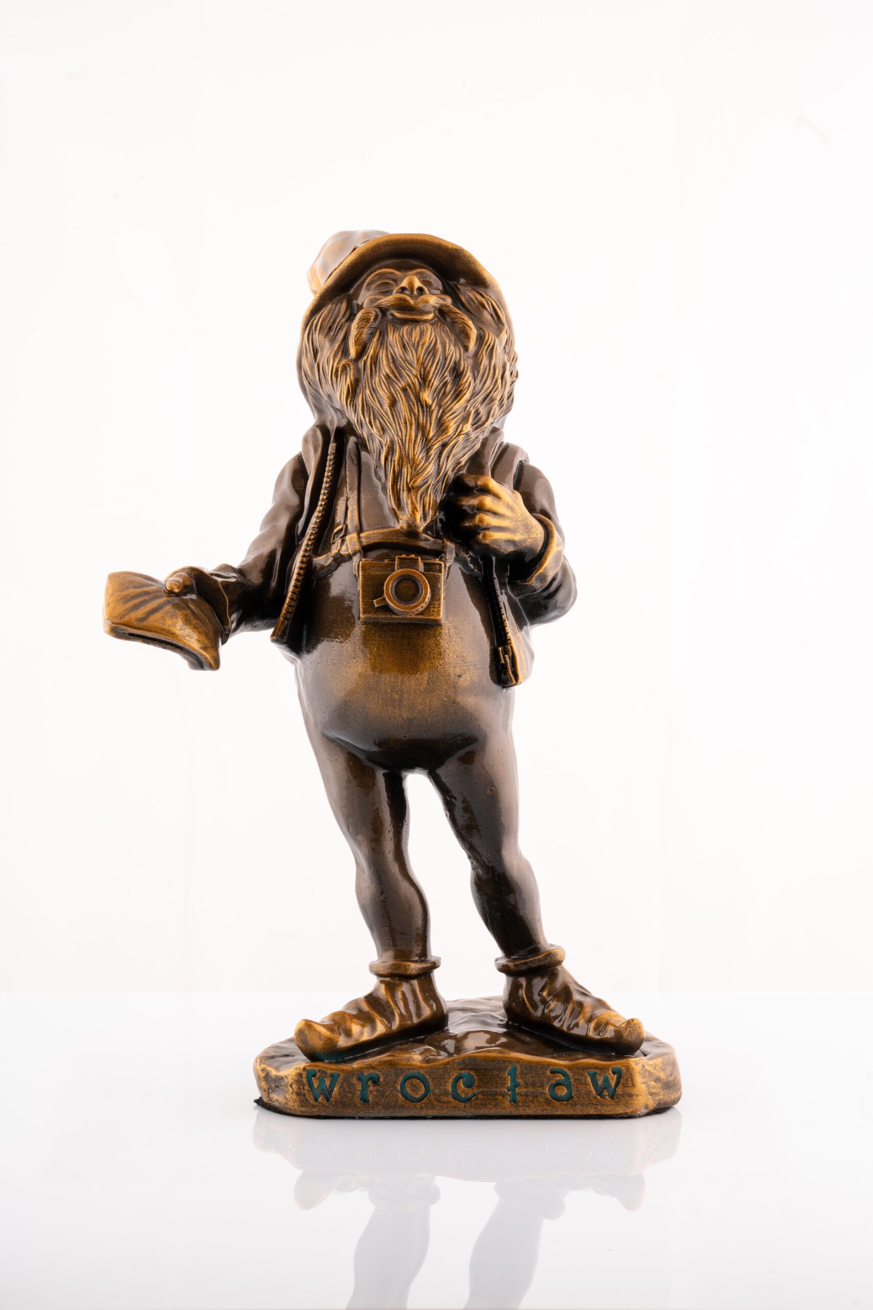 Krasnal wrocławski Turysta w efektownym formacie 36 cm. Motyw podróży i odkrywania, inspirowany wrocławskimi krasnalami. Pamiątka z Wrocławia dla miłośników wolności i zmian. Dobrze wygląda na półce/witrynie.