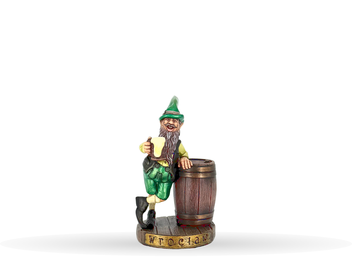 Na tle podobnych wzorów ten krasnal wyróżnia się zielonym strojem, który dodaje mu świeżości i sprawia, że figurka prezentuje się bardzo żywo. Brąz beczki, jasny kufel i ciemniejsze elementy brody oraz butów dobrze równoważą całość. Efekt jest dekoracyjny, ale nie przesadzony. Dzięki temu model pasuje zarówno do klasycznych wnętrz, jak i do bardziej nowoczesnych przestrzeni, w których liczy się mały, ale charakterystyczny detal. To dobry wybór dla tych, którzy odwiedzają sklep z pamiątkami Wrocław i wolą wrócić do domu z czymś, co rzeczywiście kojarzy się z miastem.